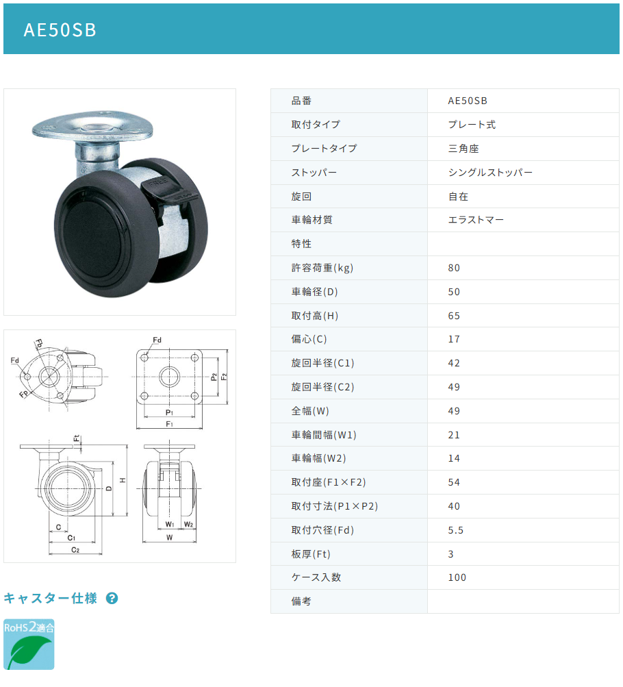 東海キャスター AE50SB 双輪キャスター [AE50SB]