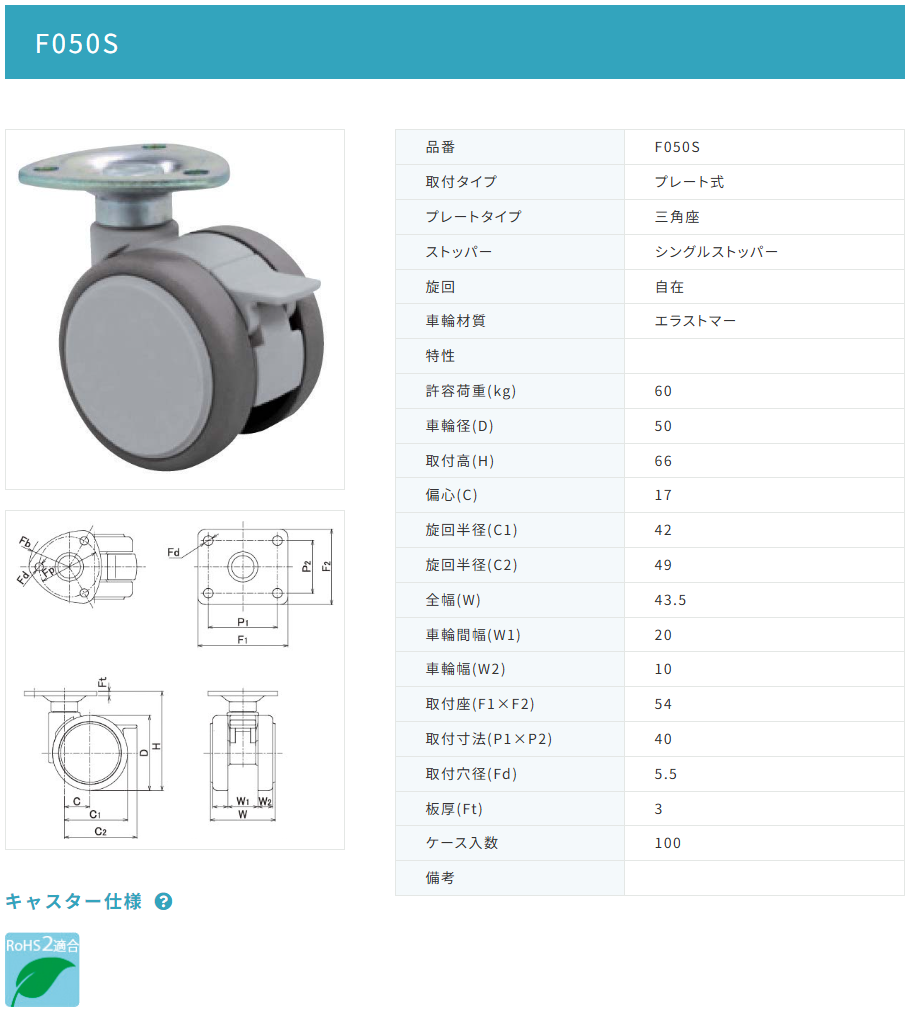 東海キャスター F050S 双輪キャスター