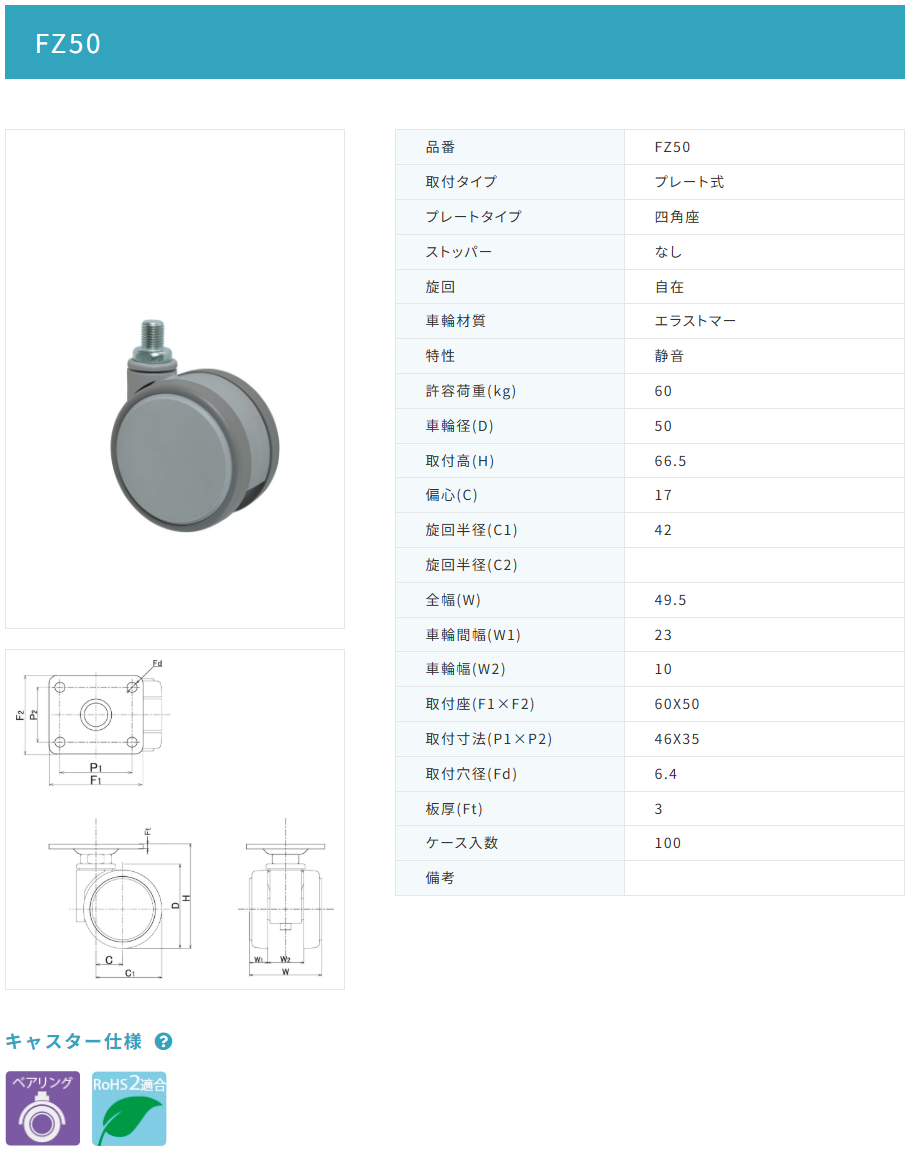 東海キャスター FZ50 双輪キャスター