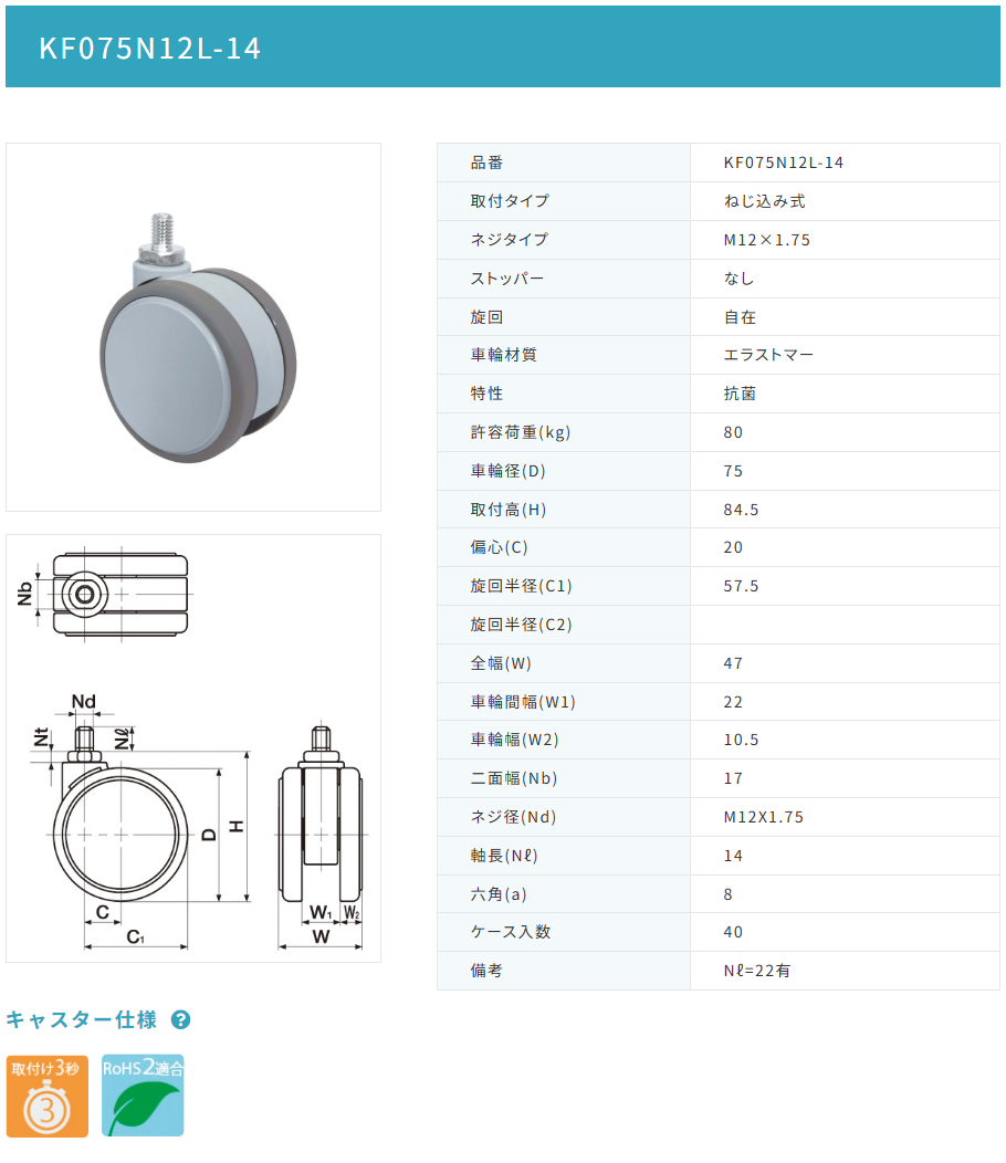 東海キャスター KF075N12L-14 双輪キャスター [KF075N12L-14]