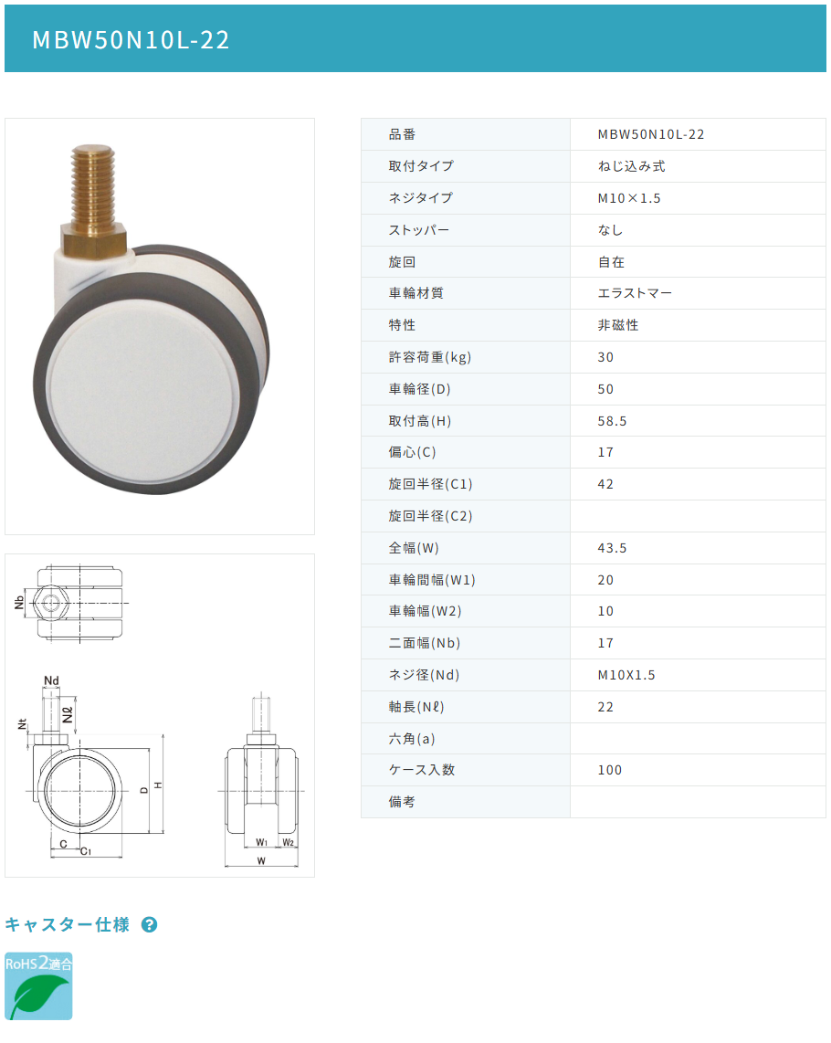 東海キャスター MBW50N10L-22 双輪キャスター [MBW50N10L-22]