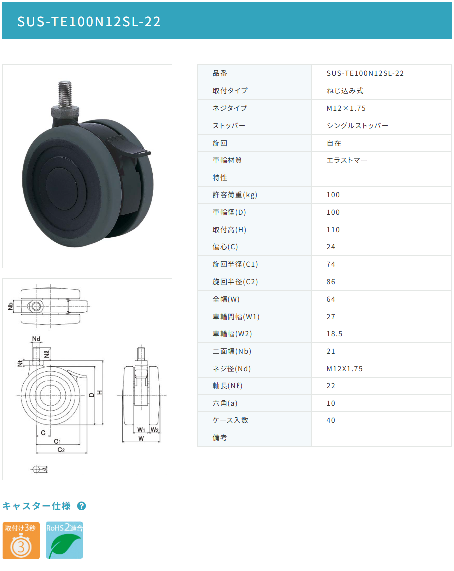 東海キャスター SUS-TE100N12SL-22 双輪キャスター