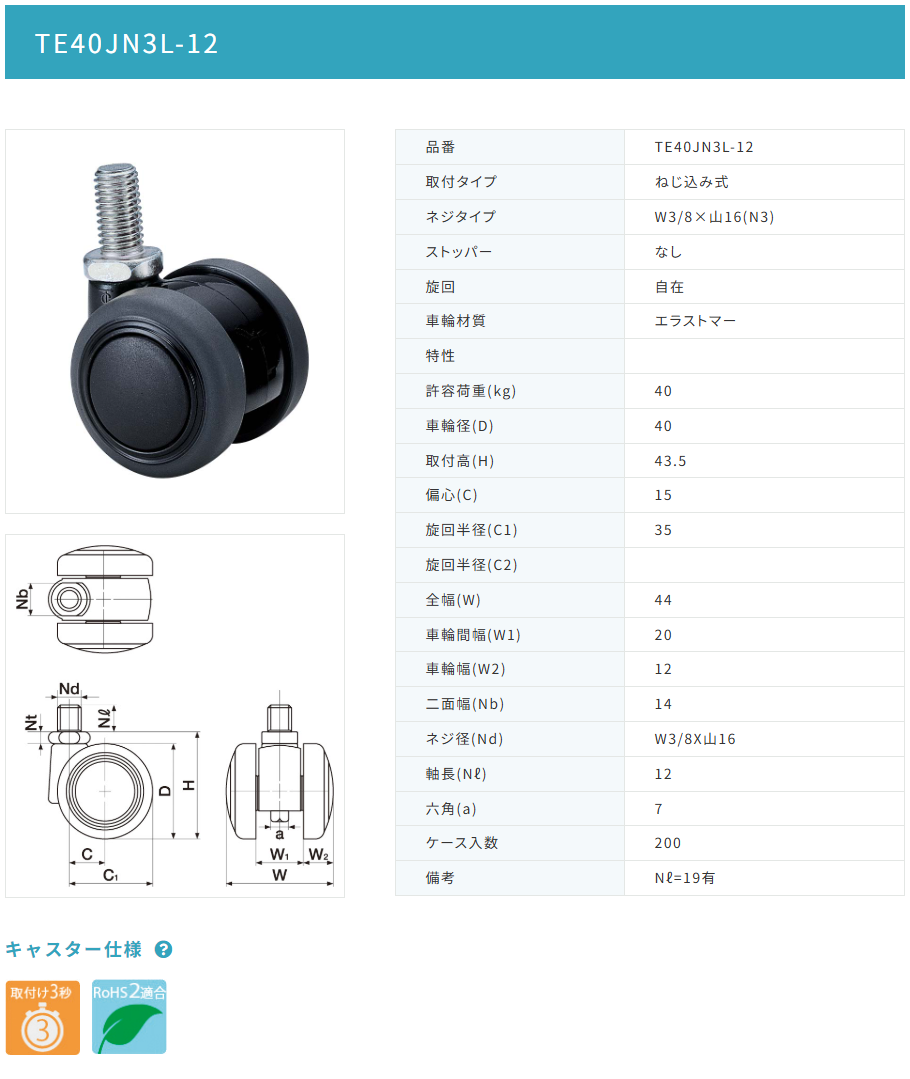 東海キャスター TE40JN3L-12 双輪キャスター [TE40JN3L-12]