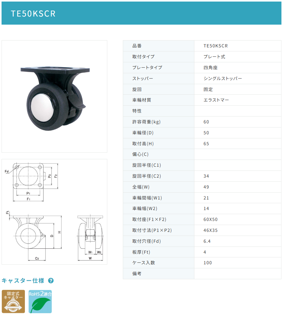 東海キャスター TE50KSCR 双輪キャスター