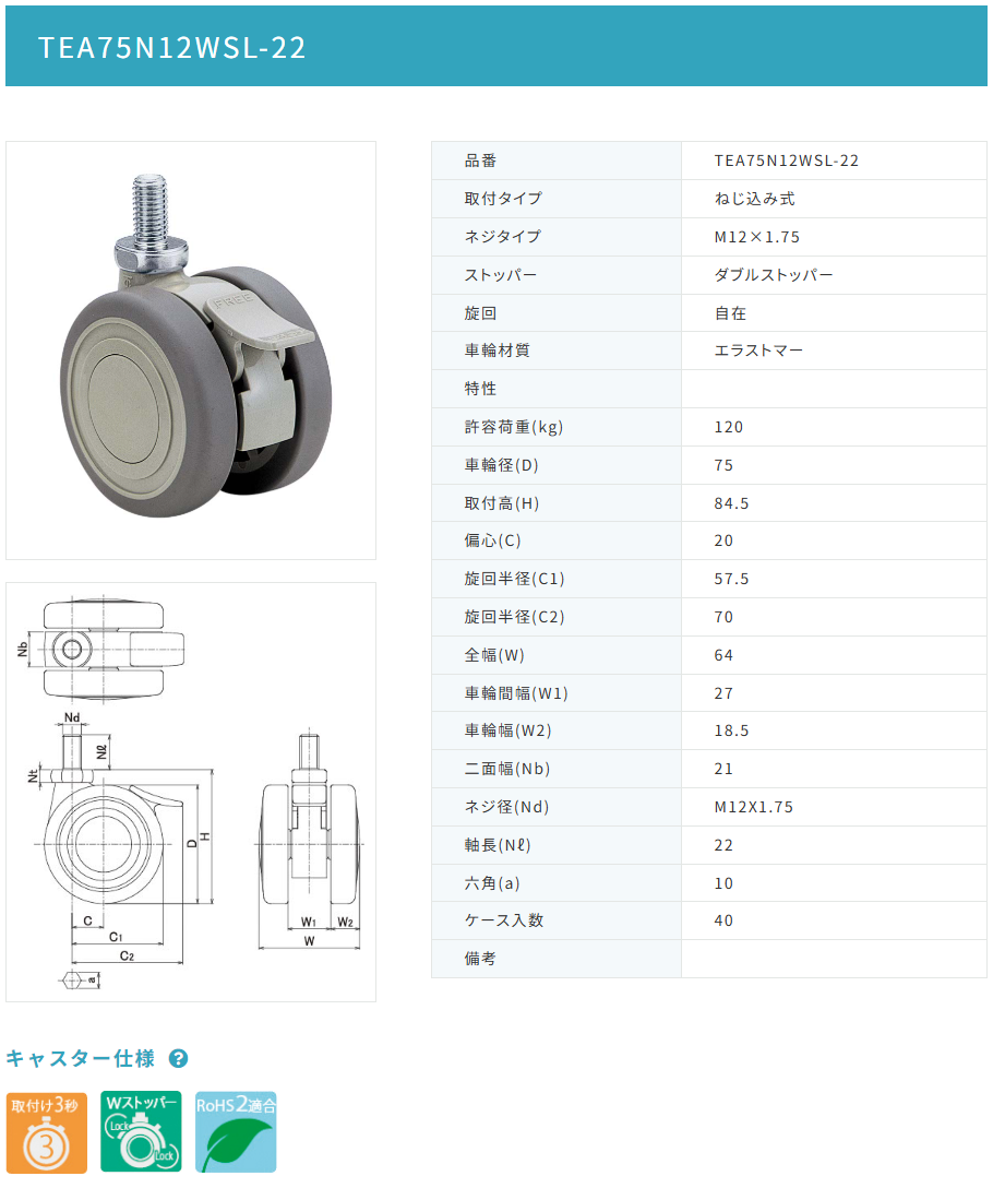 東海キャスター TEA75N12WSL-22 双輪キャスター