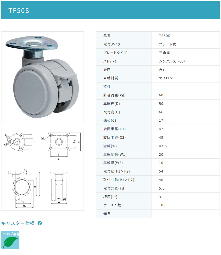 東海キャスター TF50S 双輪キャスター