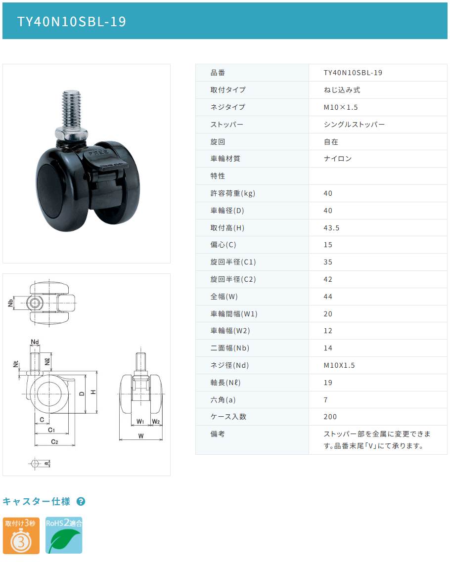 東海キャスター TY40N10SBL-19 双輪キャスター